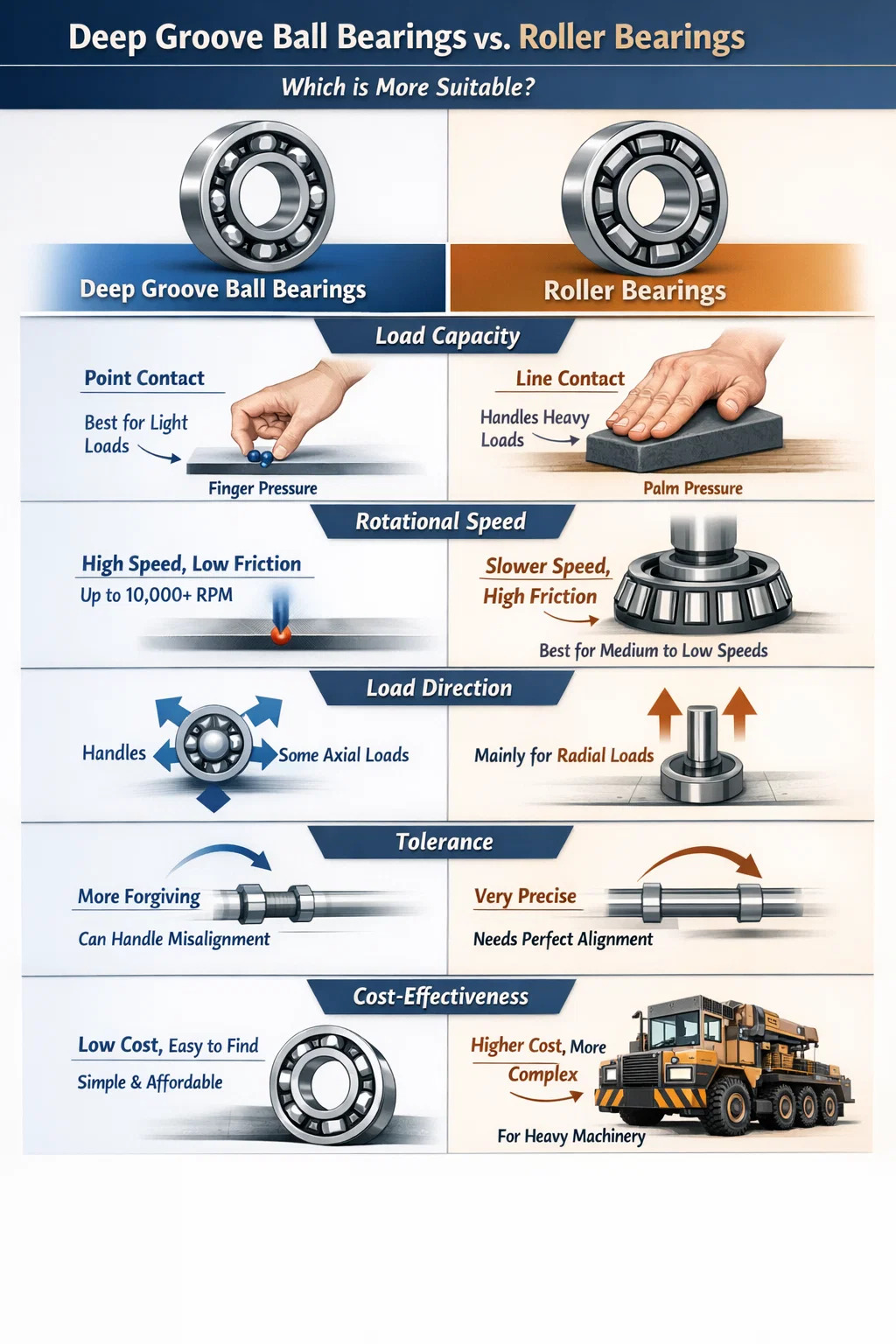 Sulcus pilae altae gestus sunt: Sunt plane "ignoscentes." Si harundo leviter misaligned, adhuc administrare possunt sine continuo defectione circumferri. Rollerus gestus: Very "fussy." Quia lineam contactum habent, alignitatem perquam accuratam in institutione requirunt. Si scapi misaligned, vis in unum angulum cylindri conligi, celeri damnum ducens.