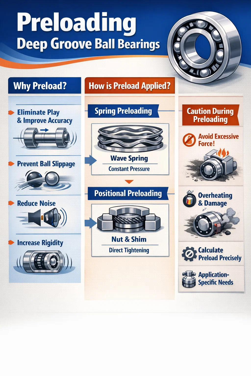 Nuces vel shims utentes (preloading positional): Anuli interiores et exteriores simul exprimuntur directe utentes nuce vel shims rectae crassitudinis. Haec methodus valde "rigiditatem" facit et potest ferre onera graviora, sed requirit altam institutionem subtilitatem; overheat et capere facile potest ferre ad overheating.
