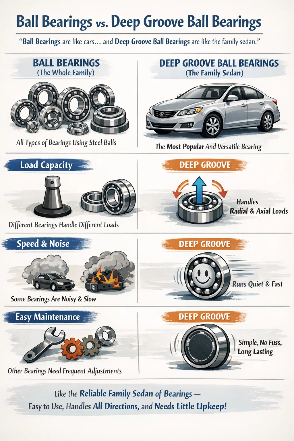 Sulcus pilae altae gestus: Propter profundas vias suas, pilae chalybeae secure in rimam tenent. Hoc eis concedit ut non solum pressionis perpendiculares stipite (onere radiali) sustineant, sed etiam per directionem sagittam (axiale onus) sustineant. Haec "versatilis" natura in plerisque machinis eos utilia facit.